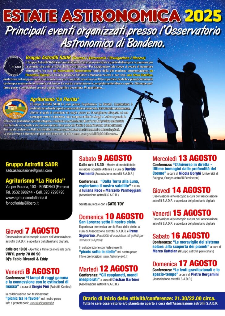 Dal 7 al 17 agosto, ti aspetta una settimana indimenticabile insieme all’Associazione Astrofili S.A.D.R. presso l’Osservatorio Astronomico Euno “Neno” Borsatti di Bondeno all’interno del suggestivo parco dell’Agriturismo La Florida che offre un’atmosfera magica e conviviale. Unisciti a noi in un’esperienza unica che unisce la bellezza del cielo stellato con i piaceri della buona cucina.